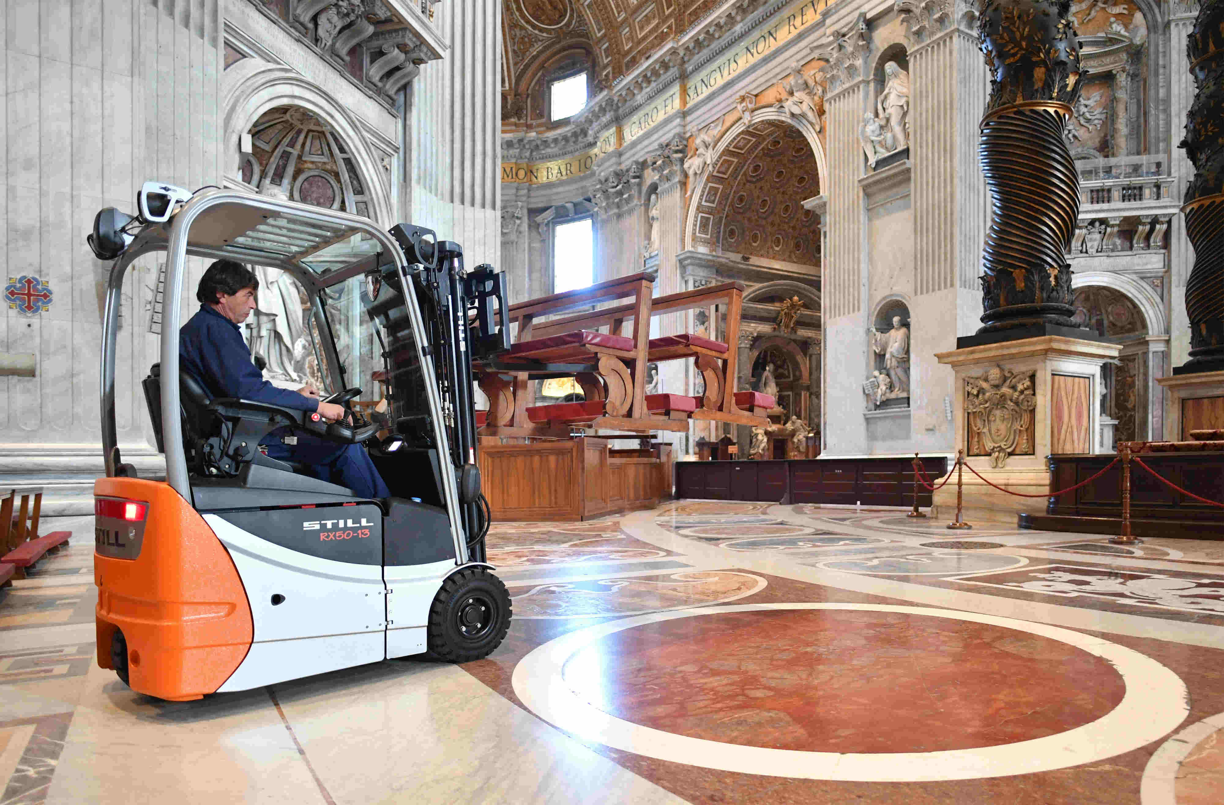Zeker geen alledaagse toepassing van een heftruck, deze RX 50 over de marmeren vloeren van de Sint Pieter in Vaticaanstad. Rustig rijden, geen strepen maken.