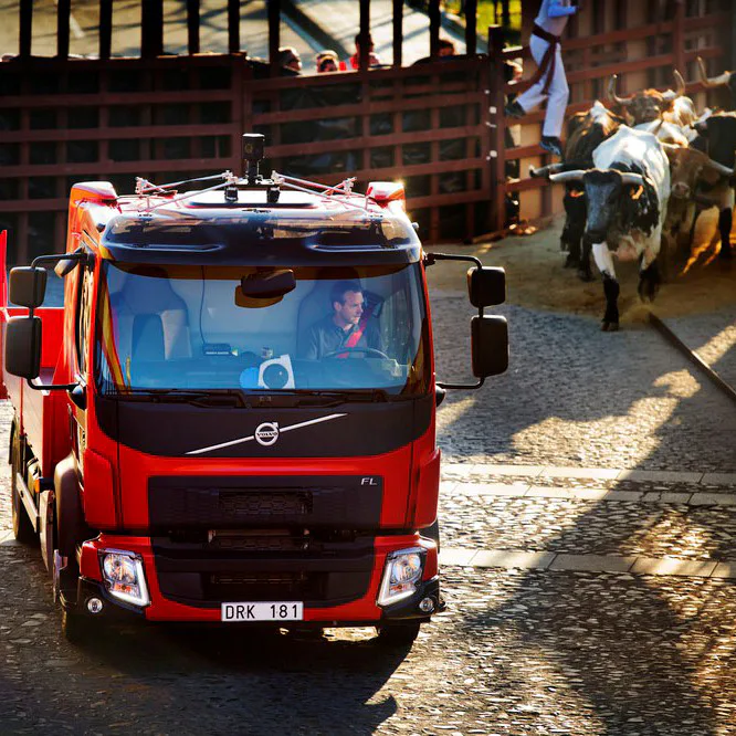 Volvo-truck opgejaagd door kudde dolle stieren