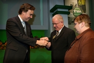 President-directeur Arjan Bos van TVM verzekeringen heeft bij de 40e Ridders van de Wegmanifestatie in Nijkerk minister Eurlings van Verkeer en ...