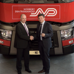 De sleutels van de eerste honderd trucks van de in totaal 530 Renault trucks zijn overhandigd aan ceo Hervé Montjotin van logistiek dienstverlener ...